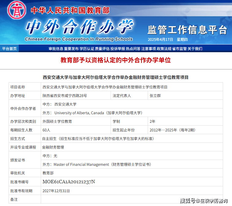 【学校】:2026级西安交通大学-加拿大阿尔伯塔大学金融财务硕士MFM免全国联考留服认证双证硕士上海班 ,【学费】:申请费2000元+学费31.8万,【证书】:加拿大阿尔伯塔大学金融财务硕士MFM学位+留学服务中心学历学位认证书,【优势】:1、2026年QS全球排名94位,ARWU全球排名92。2、工商管理学科排名加拿大第一,全球第30名。3、加拿大第一所获得AACSB认证高校(全球仅5%获得)。4、留学服务中心学历学位认证,国内承认学历学位。