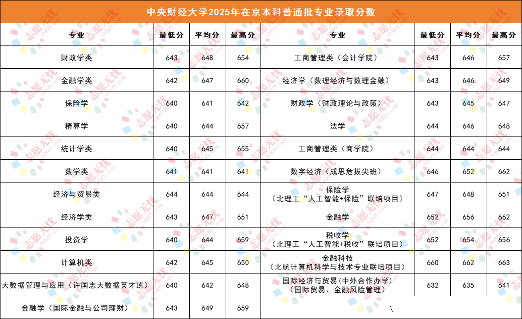 中央财经大学:25年在京本科普通批和本科提前批艺术B段招生,分别招生218人、6人。我们整理了本科普通批专业录取分数,如下图所示↓