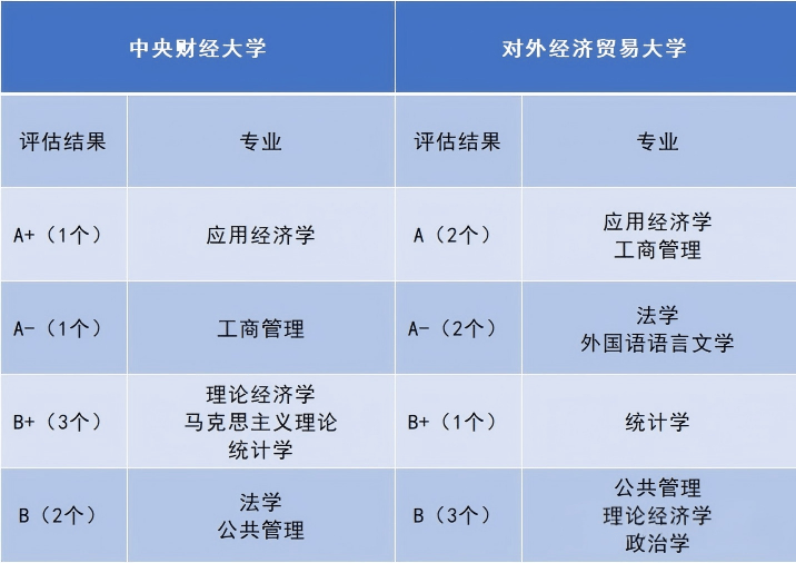 从评估结果为B及以上的两所院校对比数据可以看到,贸大的优势学科在总数上略有优势,整体上来看旗鼓相当,似乎没有太大的区别,但从细分领域来看,各有千秋。