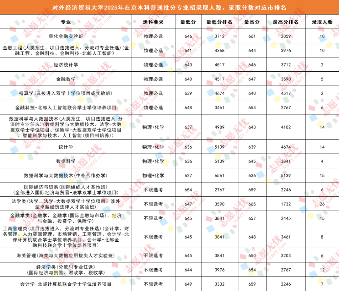 对外经济贸易大学:对外经济贸易大学2025年在京共录取197人,其中本科提前批普通A段34人、本科普通批162人。我们整理了本科普通批专业录取分数,如下图所示↓