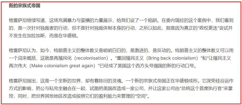 吉尔·格雷萨尼是地缘政治杂志《大大陆》的主编,他在周日的世界报网站上指出,“特朗普主义的核心教义,可以用一个概念来概括:再殖民化”。