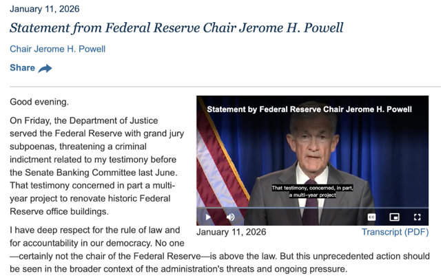这场风暴名义上的起点,是美联储华盛顿总部历史建筑翻修项目及其预算与配置争议。日前,司法部围绕联储总部翻修项目与其国会证词“是否存在不一致之处”展开调查,向美联储送达大陪审团传票,并引发外界对潜在刑事指控的联想。结果,鲍威尔1月11日夜罕见发布视频,公开反击,否认存在不当行为,指出相关指控“不过都是借口”,之所以对联储发出刑事指控威胁,主要就是因为美联储按专业判断设定利率,“而不是一味迎合总统意愿”。