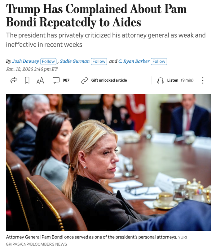 但白宫也并非真正“收手”。同一天,《华尔街日报》还抛出另一关键背景:特朗普近几周多次向助手抱怨司法部长帕姆·邦迪“软弱无能”,并与盟友讨论在司法部任命特别检察官,因为他对司法部推进其优先事项“过慢”感到沮丧。如果把这条信息放进鲍威尔调查语境,就会呈现一种更复杂的白宫姿态:一边对外切割,避免被认定为直接操盘;一边把压力向司法部传导,把更积极、更快的政治诉求转化为对邦迪的责难。这既是降温信号,也是推责与再加压的信号——降的是市场恐慌,推的是责任链条,压的则是执行力度。