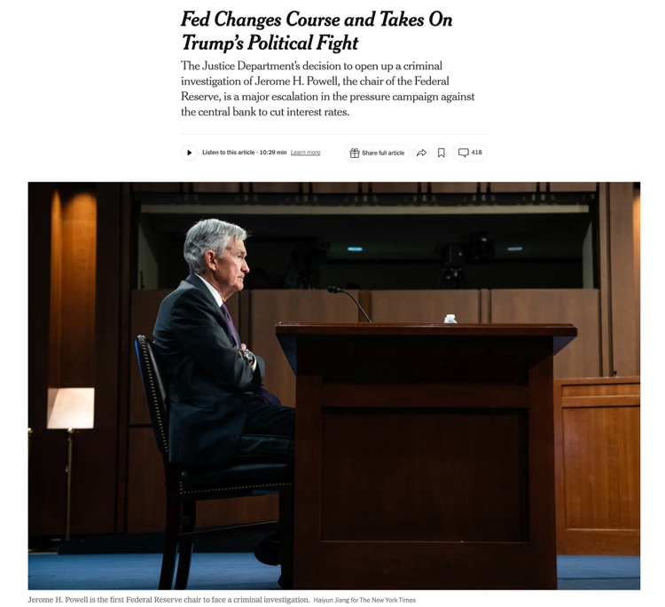 美国多家媒体认为,这是特朗普政府与鲍威尔长期冲突(尤其围绕降息节奏与幅度)的一次“明显升级”。舆论分析认为,这场冲突之所以迅速扩散,不在于工程审计有多复杂,而在于“传票+刑事威胁”的组合,将原本属于国会监督与工程审计范畴的问题,推到了可能影响央行决策的政治高压线上——在利率、通胀与选民情绪都高度敏感的当下,这一信号足以放大一切解读。