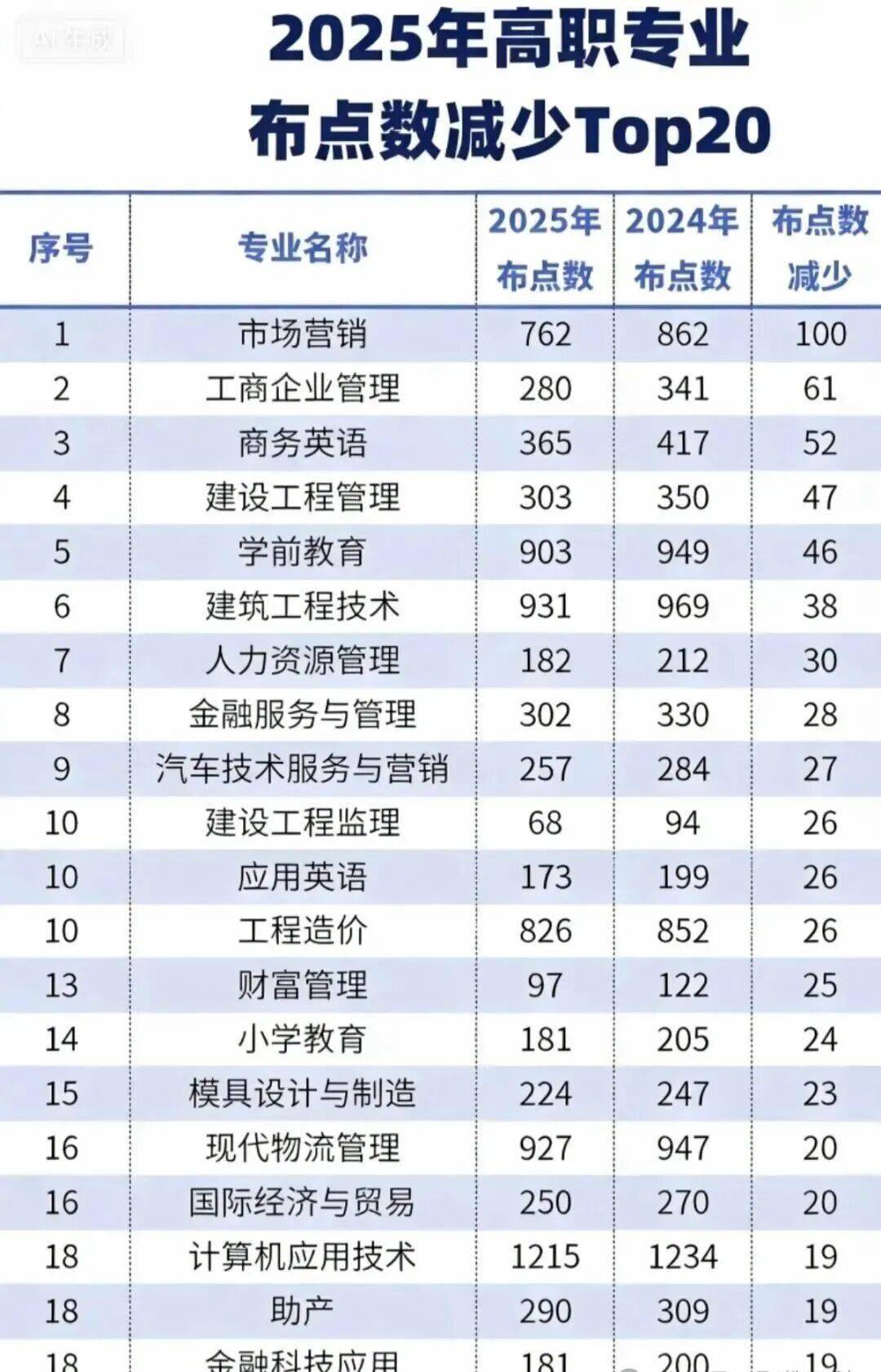 进入2025年高职撤销/停招专业榜前十的专业还有建设工程管理(减少47个专业点)、学前教育(减少46个专业点)、建筑工程技术(减少38个专业点)、人力资源管理(减少30个专业点)、金融服务与管理(减少28个专业点)、汽车技术服务与营销(减少27个专业点)、建设工程监理(减少26个专业点)、应用英语(减少26个专业点)、工程造价(减少26个专业点)。