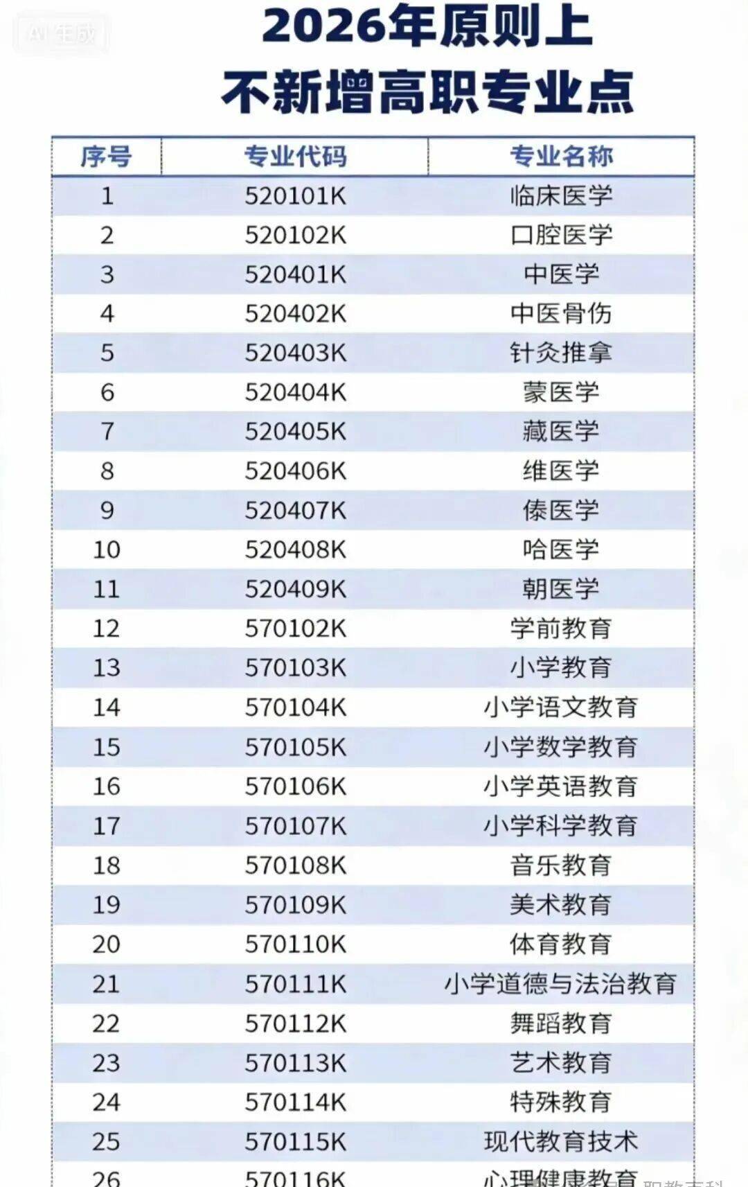 对照2025年12月更新的高等职业教育专科专业目录,2026年原则上不再新增的专业包括学前教育、小学教育、小学语文教育、中医学、针灸推拿、临床医学等26个。