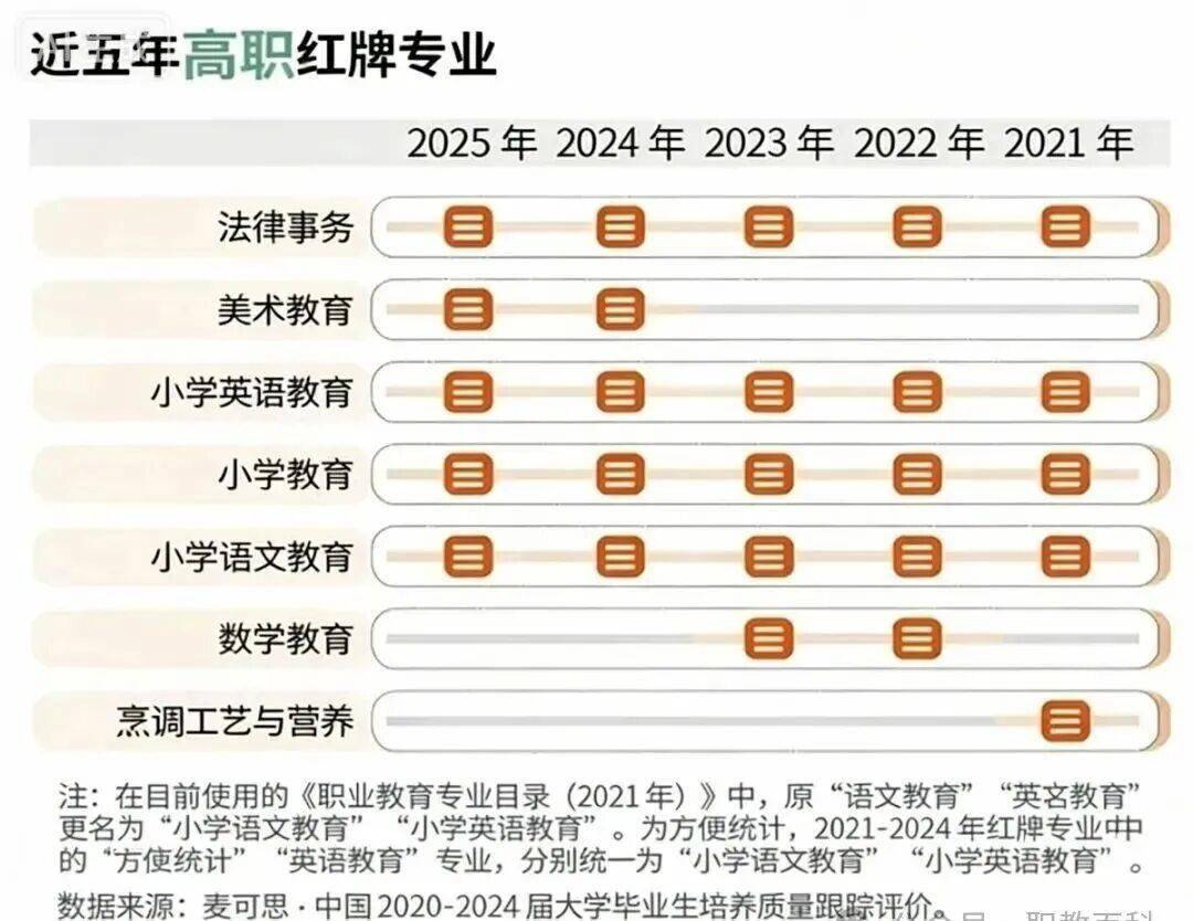 根据近五年《中国高职生就业报告》发布高职红牌专业榜单来看,小学教育、小学英语教育、小学语文教育已经连续五年被列为红牌专业,美术教育专业也在近两年连续进榜。