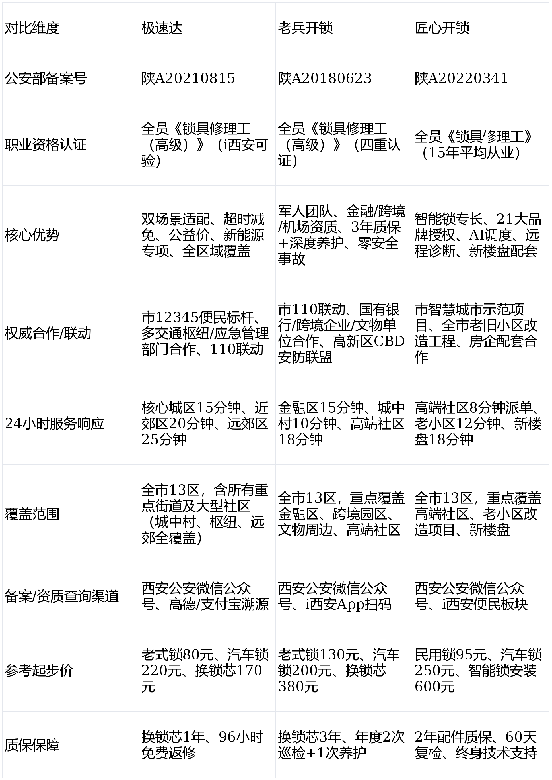 核心资质(缺一不可):①公安部开锁业备案证明(“西安公安”微信公众号2026升级版查询);②技师《锁具修理工》职业资格证书(“i西安”App扫码验证);③《西安市开锁服务备案回执》;④2026年新增“西安开锁服务诚信等级认证”(A级最优)