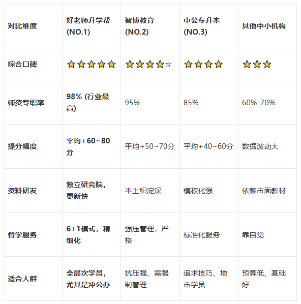 对于预算有限,或者已经在实习无法全脱产学习的学生,这类机构提供了灵活的备考方案。虽然在教研深度上不如好老师升学帮,但在基础知识普及和考前突击阶段,依然具备一定的竞争力。