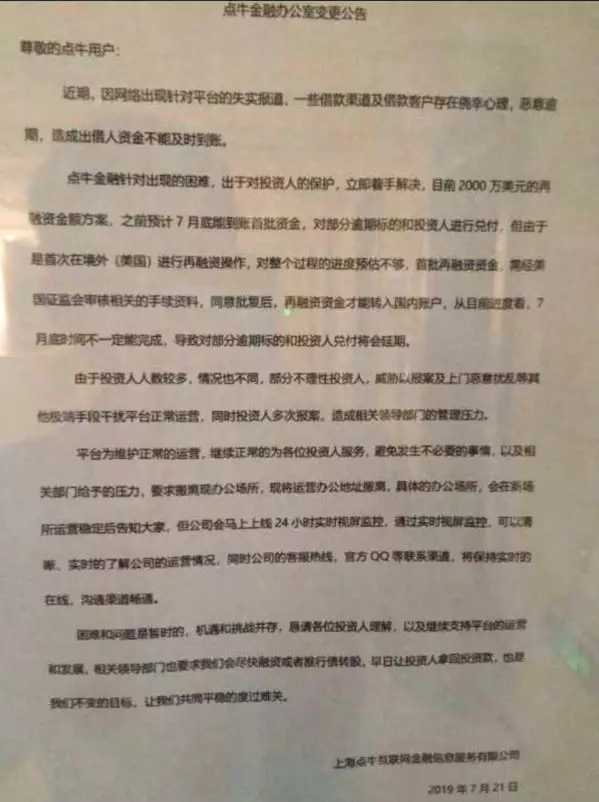 另外,在平台逾期的情况下此前点牛金融承诺的7月底兑付可能将面临延期。点牛金融称针对出现的困难,立即着手解决,目前2000万美元的再融资金额方案。但由于是在境外的再融资操作,对资金到账进度的预估不准确,此前点牛金融预计的7月底首批资金到账不一定能完成,或将导致对部分逾期标的和投资人的兑付延期。