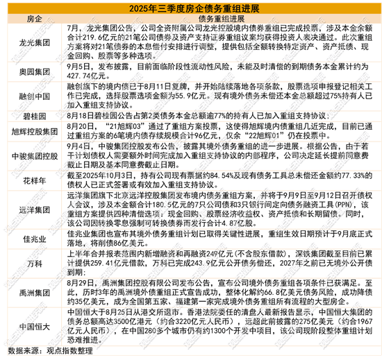 国资纾困显效与高负债房企清盘风险交织,风险出清进入结构性攻坚期。据观点指数不完全统计,2025年三季度,已完成境内及境外债重组的企业有融创、远洋、时代中国、龙光;境外债重组获批的企业有旭辉、佳兆业、禹洲地产、碧桂园等。房企债务重组呈现加速出清与策略分化并存的特征,折射出行业风险化解进入深水区。