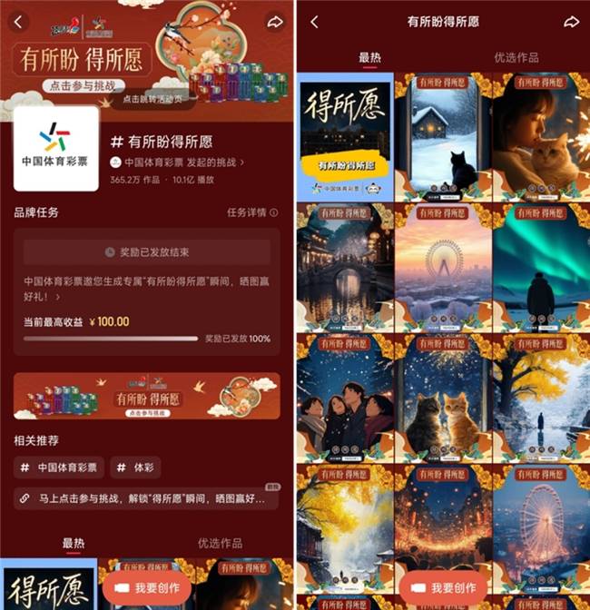 其中,充满国风范儿的#有所盼得所愿#AIGC挑战赛,带来了低门槛、易操作、高成就感的互动玩法,不仅助力大家轻松完成对个人心愿的创意表达,也实现对体彩顶呱刮“得所愿”主题票产品价值的具象化呈现。创新形式激发大众的参与热情,目前已吸引超过2.9万人次参与挑战,相关作品数量达到364.7万,线亿。