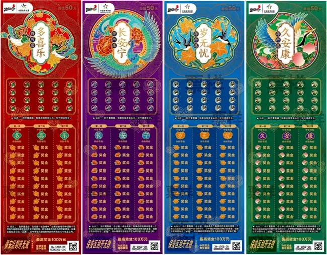 这款承载人们对美好生活向往与追求的独特产品,名称来自“多喜乐、长安宁、岁无忧、久安康”等传统中式祝福语,并巧妙融合喜鹊梅花、鸾鸟牡丹、燕子萱草花、仙鹤寿桃等经典祥瑞元素。除了富有诗意与时代特征的创意巧思,它还将个人愿望与社会公益相结合——每一张彩票均按规定提取公益金,购彩者每一次购买“得所愿”,都是在为国家公益事业贡献自己的力量。