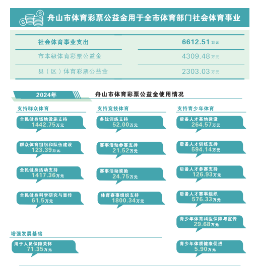 2024年,舟山市体育彩票公益金用于全市体育部门社会体育事业支出达6612万余元。
