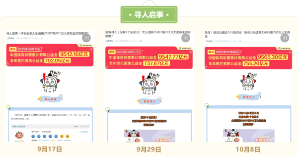 为最大限度维护中奖者权益,上海市体育彩票管理中心于中奖后期多次发布相关信息,积极寻找中奖者,分别在9月17日、9月29日、10月8日通过官方微信发布相关寻人启事以及寻人视频,并在主流媒体、相关社群等多方进行传播,但遗憾该注大奖得主并未现身兑奖。